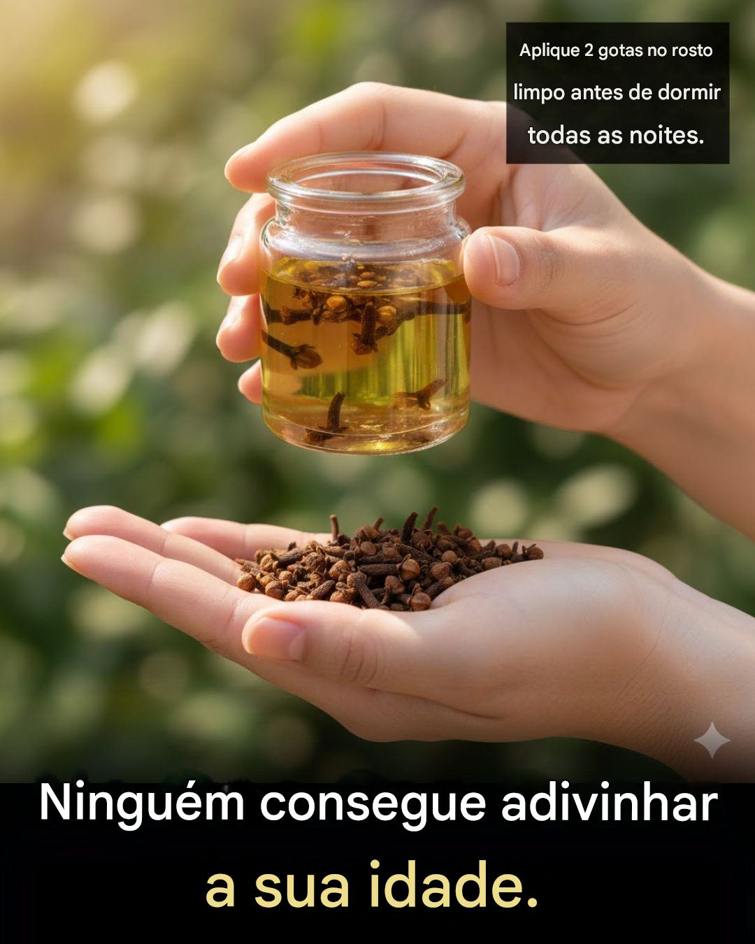 O óleo de cravo possui propriedades antibacterianas e antifúngicas, excelentes para tratar problemas de pele que podem contribuir para o envelhecimento precoce, como acne ou infecções. Uma pele limpa aparenta ser mais jovem e vibrante. -